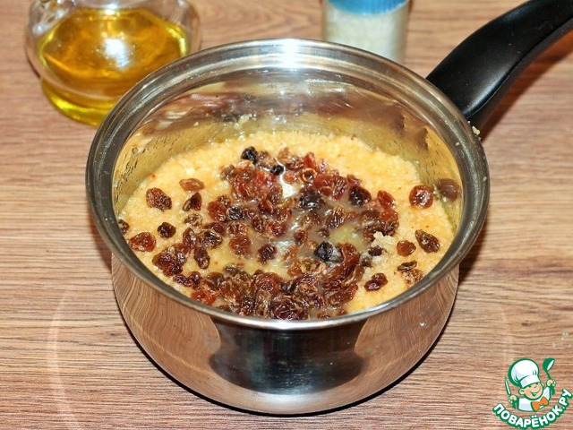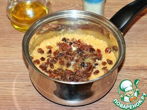 • 5. Кладем изюм, 1 ломтик яблока, солим и перемешиваем. Закрываем кастрюлю крышкой, уменьшаем огонь и готовим, пока долька яблока не станет мягкой.
