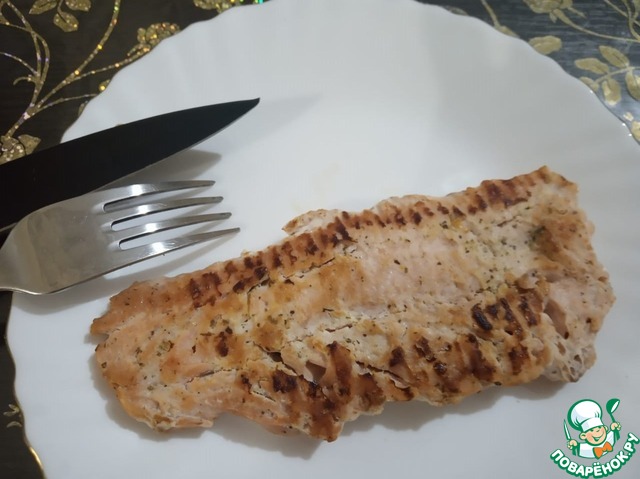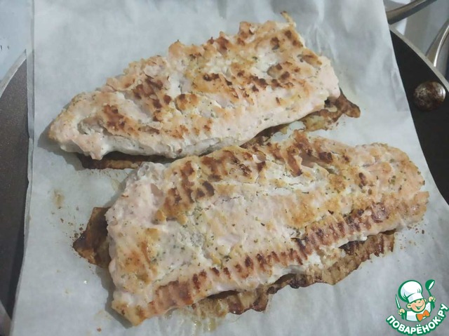 Рыба по этому рецепту готовится на сковороде на пергаментной бумаге. За счёт этого она остаётся сочной и сохраняет свои полезные свойства.