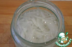Репчатую луковицу нарезать тонкими полуколечками, положить в небольшую баночку, залить водой, добавить щепотку соли, 0,5 ч. л. сахара и уксуса (маринад должен быть кисло-сладким на вкус). Мариновать не более 20 минут. По истечении времени маринад слить.