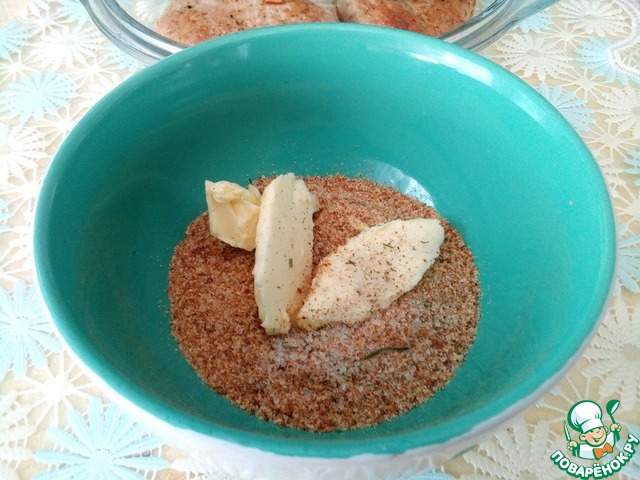 Приготовить штрейзель для мяса. Сливочное масло хорошо перетереть с панировочными сухарями, добив соль и перец по вкусу. У меня адыгейская соль и сухари ржаные. С белыми сухарями будет светлое мясо.
