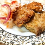 Подготовленную свиную мякоть просушить и отбить при помощи тендерайзера - это ручной рыхлитель для отбивания мяса и других продуктов. Если такового нет, то просто, легонько, тупой стороной ножа, нужно пройтись по всему мясу вдоль и поперек. Отбивать молоточком мясо не нужно. Вы просто выжмите из него весь сок и мясо будет сухим. В идеале взять свиную корейку на косточке, но можно взять любую мякоть. У меня здесь с шейки.
