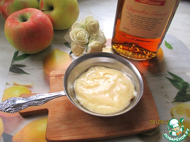 Я готовила этот нежный потрясающий крем для подачи Рождественского пудинга. Но он также отлично подходит в качестве топинга к блинчикам, мороженому. Или же его можно использовать как крем для торта, - отлично он подойдет к Наполеону. А вообще мои дети едят его просто так и с печенье. Конечно, если готовите для детей, коньяк стоит исключить. Готовится крем из самых доступных и недорогих продуктов, которые есть в каждом доме! И указанного количества ингредиентов Вы получите около 1кг крема, - это скорее подойдет для торта. Если крем Вам нужен в качестве топинга, уменьшите количество составляющих в 2-3 раза.