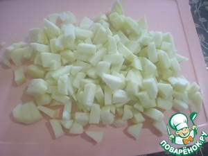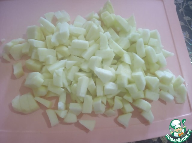 • Заливаем изюм на пару минут кипятком. Промываем холодной водой и высыпаем на бумажное полотенце, чтобы ягодки обсохли. Яблоки (если плоды не крупные, можно взять больше) очищаем от кожицы и семян, нарезаем небольшими кубиками.