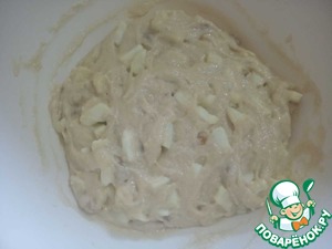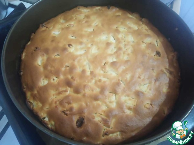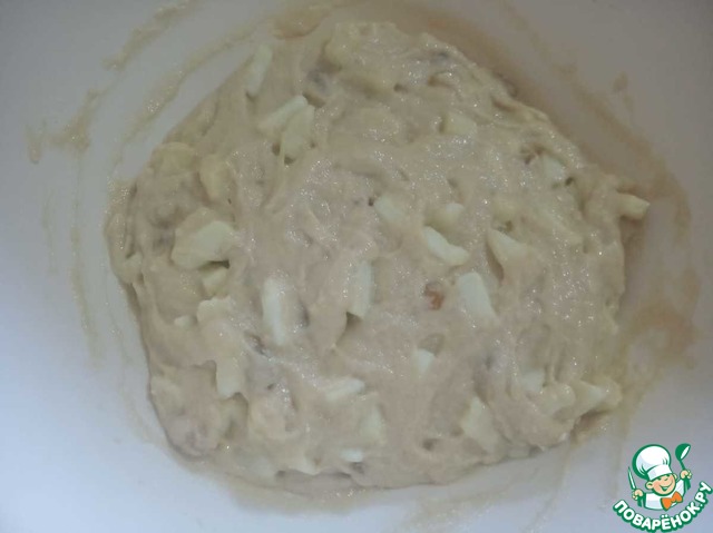 • Добавляем в тесто яблоки и изюм и хорошо перемешиваем. Можно застелить форму пергаментной бумагой или просто смазать маслом и выложить тесто.
