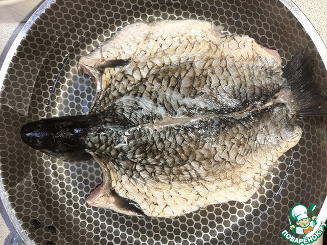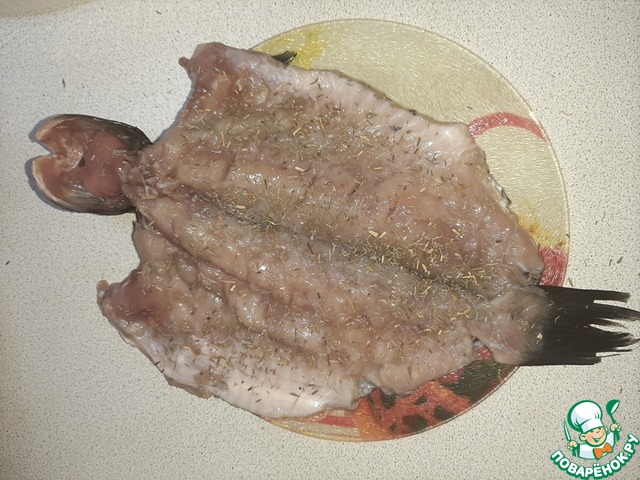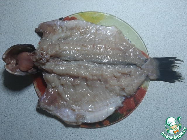 Рыбу почистить, удалить внутренности и жабры. Сделать надрез вдоль хребта, не доходя до головы. На брюшке также сделать надрез до конца с обоих сторон. Удалить крупные кости и хребет. Сделать это можно ножницами либо надрезая ножом и вытаскивая каждую кость, а затем аккуратно удалить хребет.