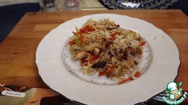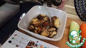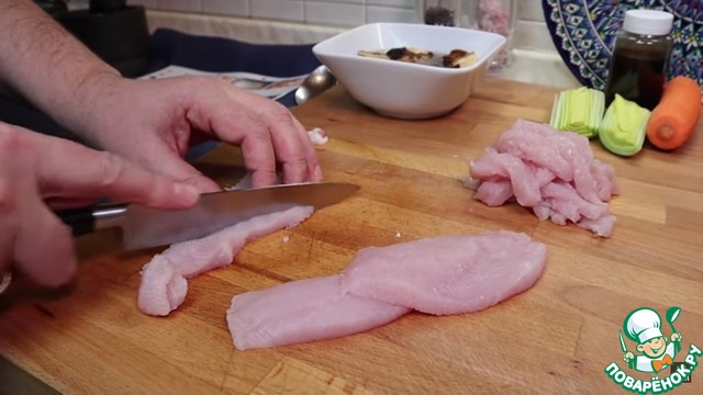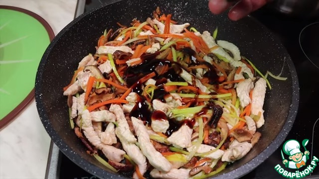 5. Обжариваем морковь на сковородке 2-3 мин, следом на сковородку отправляем индейку, лук-порей и грибы. Солим и перчим по вкусу.