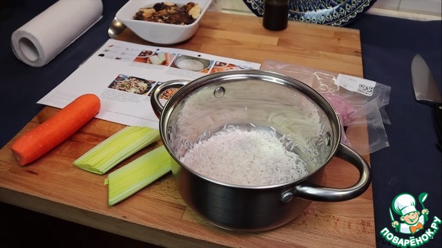 2. Разрезаем лук-порей вдоль на две части. Промываем рис и ставим его вариться ( 12 мин).