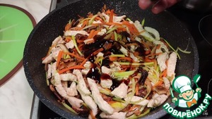 6. Добавляем устричный соус и 4 столовые ложки воды.