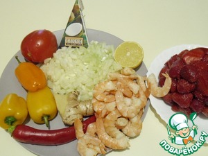 Креветки очистить от панциря и голов, лук репчатый очистить и нарезать мелким кубиком. Болгарский перец очистить от семян, нарезать аналогично луку.