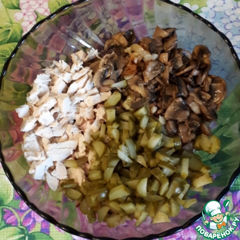 Нарезать куриное филе и корнишоны, добавить в салатник жареный лук и грибы.
