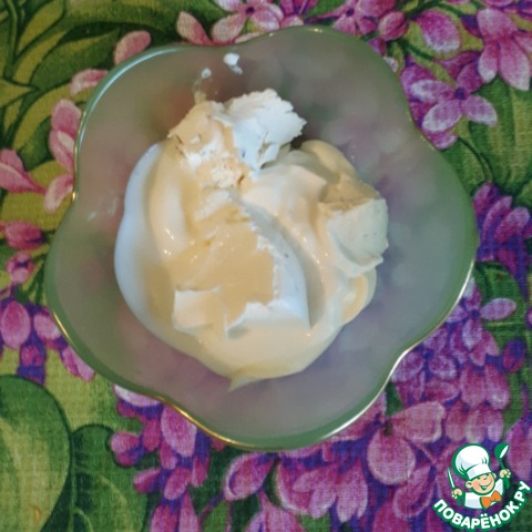 Приготовим заправку. Смешать сметану, майонез и сыр сливочный (типа Хохланд, Альменте).