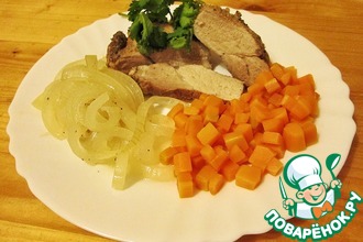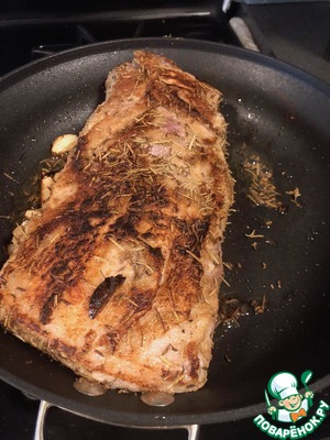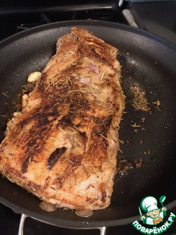 Затем сверху кладём кусок свинины и обжариваем со всех сторон около 10 минут.