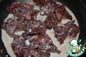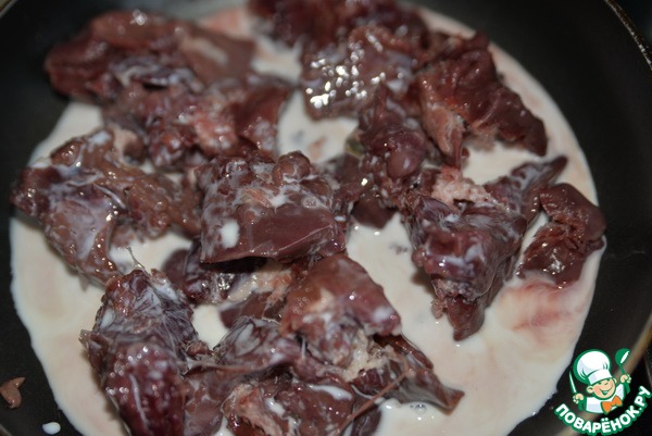 Куриную печень моем, зачищаем от плёнок. Кладём на сковороду. Заливаем молоком.
