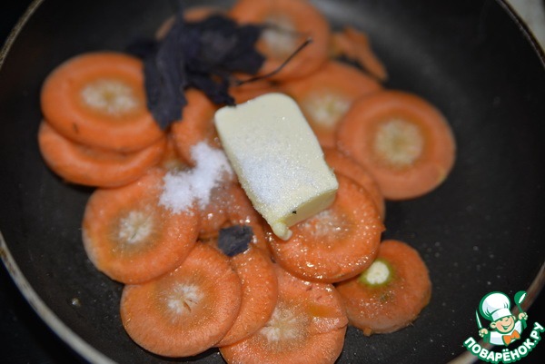 Карамелизируем морковь. Для этого около 5 минут обжариваем кружки моркови в 1 ст. ложке сливочного масла с сахарным песком и базиликом. У меня сушёная зелень, в оригинале розмарин, можете использовать зелень на свой вкус.