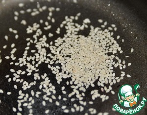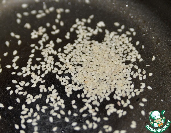 Небольшую сковороду накаливаем, но оставляем сухой. Бросаем зерна белого кунжута, нагреваем 2 минуты до окрашивания в легкий золотистый цвет.
