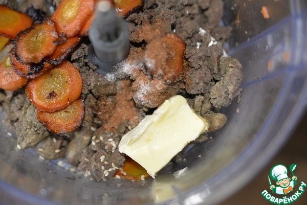 В чашу блендера кладём слегка остывшую печень, карамелизированную морковь (немного оставляем для декора), 80 гр сливочного масла, кунужут, соль, смесь перцев.