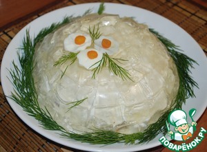 Новый год к нам мчится. Уже! Вот вариант новогоднего слоёного салата. Вас и гостей порадует вкусное содержимое салата и необычный внешний вид. Кусочки куриного желе добавят прохлады в жаркую новогоднюю ночь. С наступающим, кудесники и кудесницы Поварёнка!!!