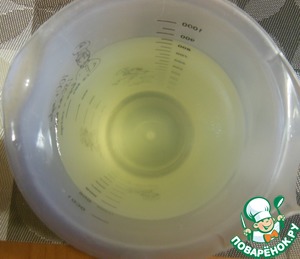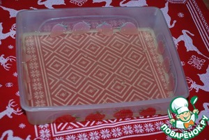Отмерить 3 стакана бульона ( я процедила его ещё через марлю). Желатин залить половиной стакана бульона (от общего количества). Дать набухнуть, распустить и влить в тёплый бульон. Вылить в ёмкость так, чтобы слой бульона был в 1,5 см. Лучше это сделать в круглой форме. Проще будет формовать "купол". Я делала в двух формочках. Дать застыть. В этот раз желатин дал моему бульону желтоватый оттенок. Это немного расстроило, но на вкус не повлияло.