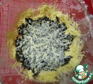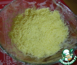 Дно и стенки круглой чаши выложить пищевой плёнкой. Слегка смазать майонезом. Выложить слой натёртого сыра, прижимая немного руками сырный слой.