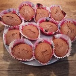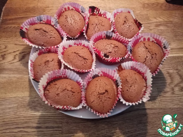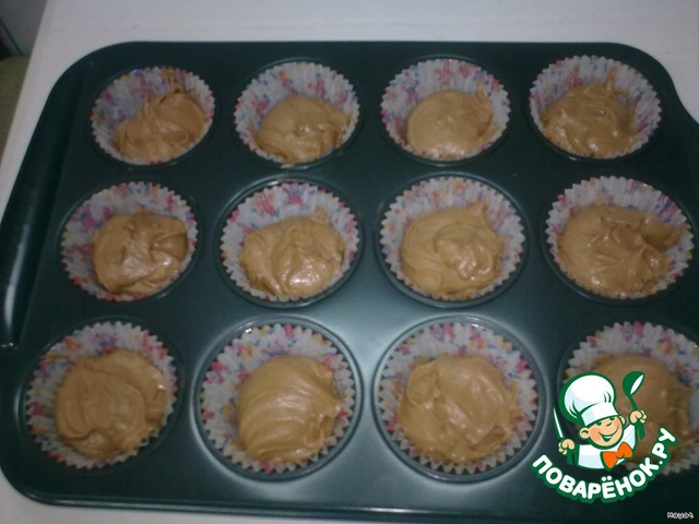 Затем добавляем:какао+муку. Тоже хорошенько взбиваем. Раскладываем тесто в формочки со специальными бумажными чашечками, чтоб тесто не прилипло.