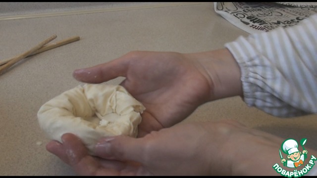 Потом аккуратно сжимаем тесто и делаем гармошку, для этого нам и понадобились палочки.