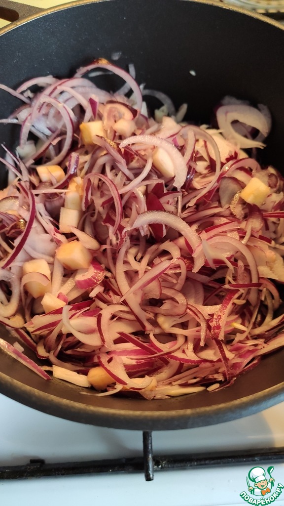 В кастрюлю или сковороду с толстым дном, добавляем немного растительного масла и обжариваем на небольшом огне лук с яблоком минут 10.
