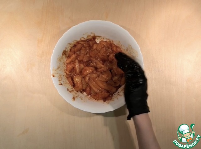 Начинаем мариновать мясо: нарезаем грудку и добавляем Терияки и паприку. Хорошенько перемешиваем и ставим мариноваться на 15 минут.