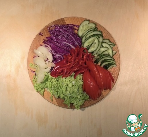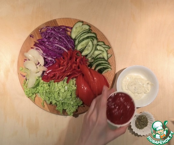 Соус, пекинская капуста, краснокочанная капуста, паприка, лук, огурец, помидор, соус. -