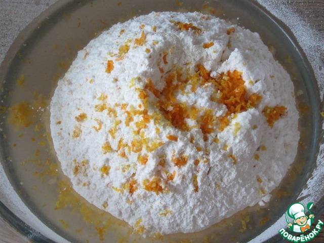Приготовить тесто. В воде растворить сахар и соль, добавить растительное масло. Всыпать примерно половину муки с разрыхлителем, ванилином и цедрой лимона и апельсина, перемешать.