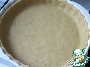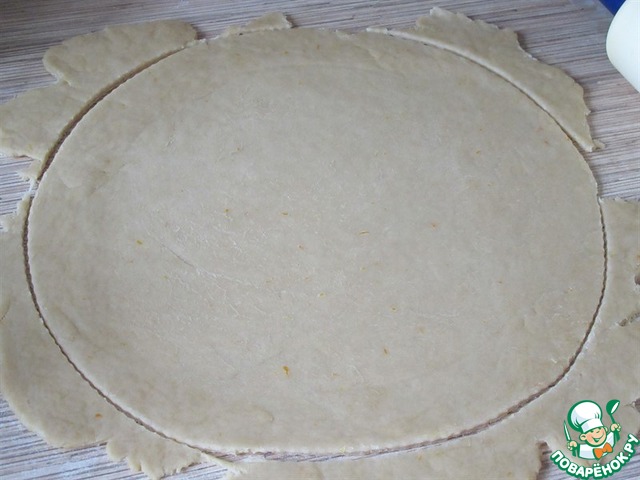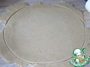Отдохнувшее тесто раскатать толщиной около 2-3 мм, вырезать круг на 5-6 см больше диаметра Вашей формы.