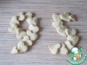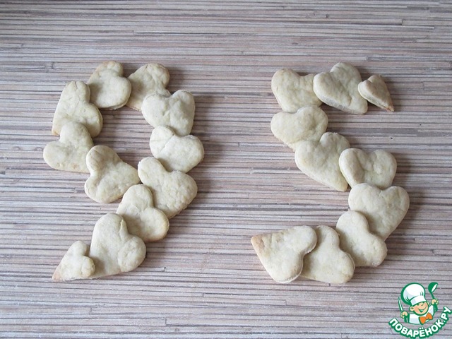 Из остатков теста вырезать маленькие фигурки (по случаю у меня сердечки, но могут быть и звездочки, и листочки, что угодно). Из части фигурок выложить цифру или композицию по новогодней теме. Например, елочку из звездочек, или цифру "31". У меня, естественно, 95)) Испечь фигурку и вырезанные печенья при 190*С около 10-12 минут.