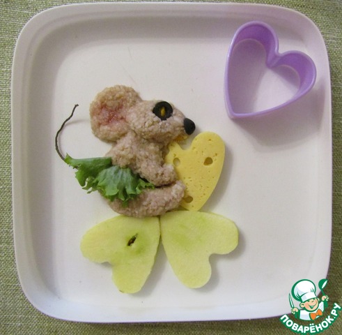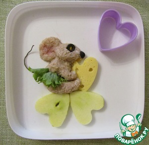 Из сыра с помощью формочки в виде сердечка вырезать сердце, дырочки сделать с помощью соломинки. Из цедры апельсина вырезать юбочку и хвостик. Глазик и носик - ягодка или оливка. Все, мышка Иришка готова! Порадуйте своих детишек такой мышкой на Новый год!