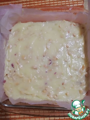 Небольшую форму выстелить пергаментной бумагой и равномерно лопаткой распределить по форме тесто. У меня форма 21×21 см.