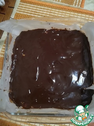 Для глазури растопить шоколад со сливочным маслом любым удобным способом. Я растапливаю импульсами в микроволновке. Вылить шоколад поверх карамельного слоя. Охладить для стабилизации слоев не менее 2 часов в холодильнике.