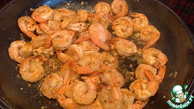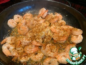 Как только креветки разморозятся и дадут жидкость слейте ее, добавьте к креветкам оливковое масло, чеснок выдавленный прессом и специи.