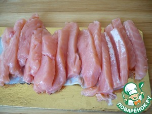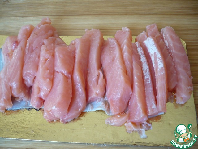 Слабосоленую семгу нарежьте ломтиками, срезая мясо с кожи.