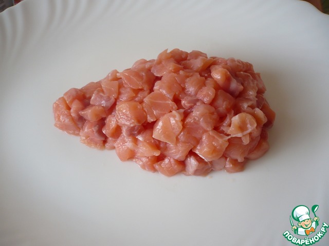 Затем каждый ломтик семги нарежьте мелкими кубиками. Выложите на блюдо в виде капли.