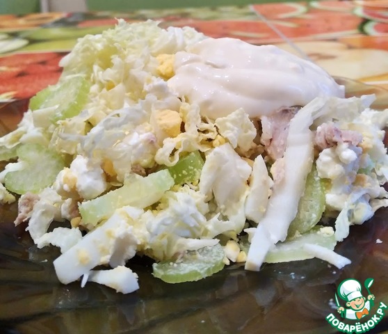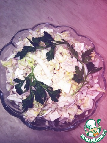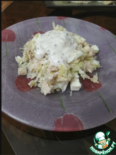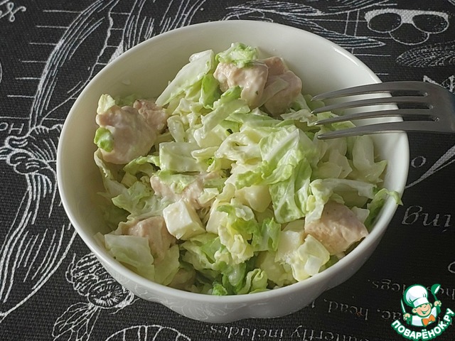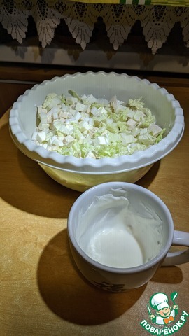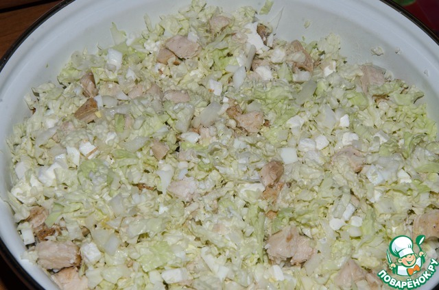 Пекинки,курицы и сыра по виду одинаковый объем, заправка - майонез+сметана+перец черный молотый (по вкусу).
