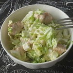 Пекинскую капусту нашинковать, выложить в миску, добавить к ней по щепотке соли и сахара и слегка помять руками.