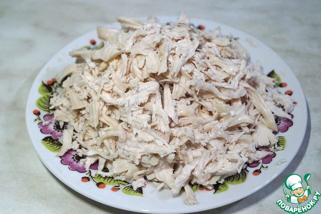 Вынуть грудки из бульона, остудить, отделить мякоть от костей и кожи, нарезать мелкими кусочками. Бульон процедить. -