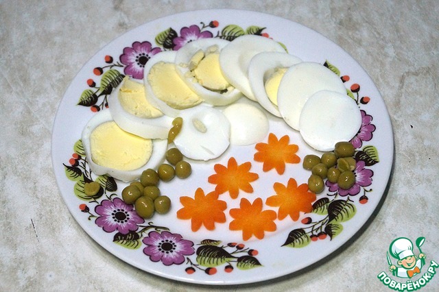 Яйца нарезать кружочками, морковь -кружочками или с помощью специальной выемки вырезать цветочки.