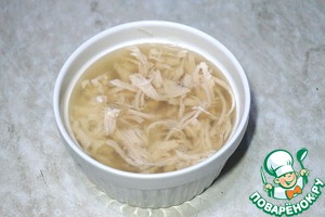 Затем желатин распустить в горячем курином бульоне (3-4 стакана), процедить.