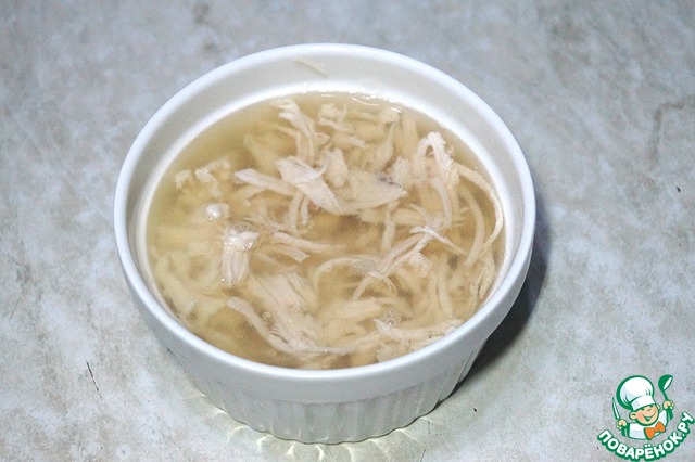 После сверху выложить куриное мясо, залить оставшимся бульоном, убрать в холод до полного застывания. -