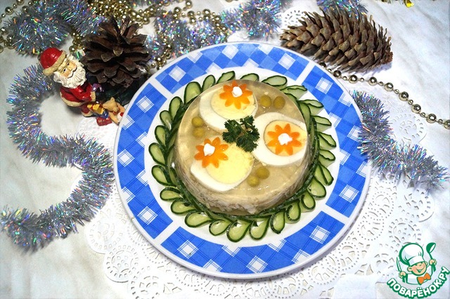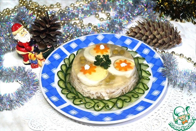 Курица в желе - аппетитная закуска, которая отлично подойдет к праздничному застолью. Готовится просто, из доступных ингредиентов. Главные компоненты -куриное мясо, морковь и яйцо. Для придания красочного праздничного вида можно добавить горошек или кукурузу и украсить зеленью петрушки и свежим огурцом.