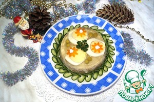 Формочки на 5 мм высоты залить куриным бульоном, поставить в холод на 15-20 мин. Затем на застывшее желе выложить кружочки яйца и моркови, горошек, залить куриным бульоном, слегка покрывая содержимое, убрать в холод на 15-20 мин.