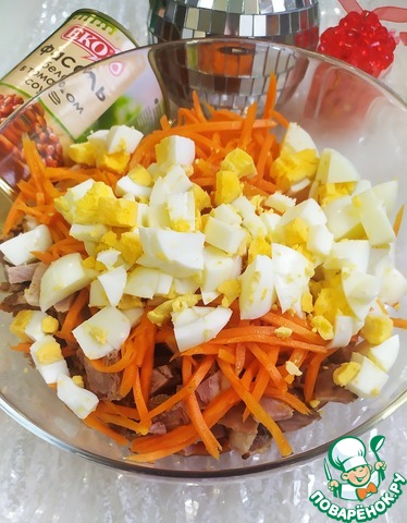 Яйца нарезать на небольшие кубики и добавить в чашу.
