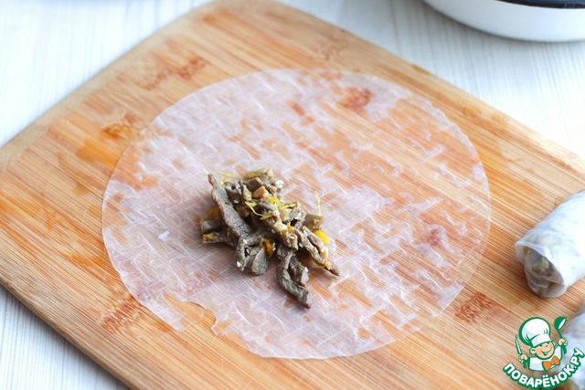 На середину листа рисовой бумаги выложить подготовленную начинку с мясом утки.