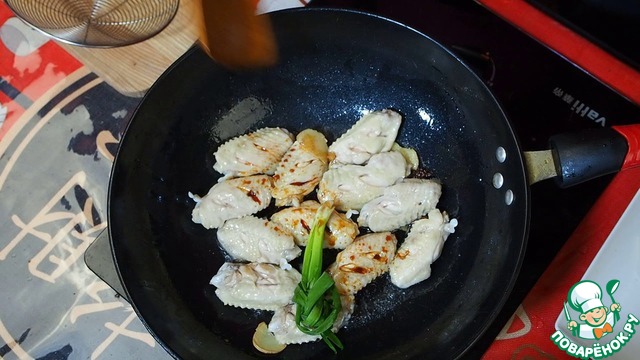 В чистый вок наливаем немного масла, кладем вареные крылья, имбирь, бадьян и немного обжариваем на среднем огне. Далее добавляем соль, зеленый лук и соевый соус.