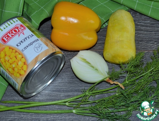 Лук нарезать кубиком, залить кипятком, сразу же пролить холодной водой, смешать с куркумой, так подкрасить лук. Выложить его к кукурузе.