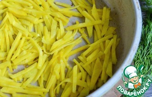 Морковь вымыть, почистить, нарезать соломкой (тёрка для моркови по-корейски). Слегка обжарить на растительном масле, только сделать морковь мягкой, без поджарок и румяности.